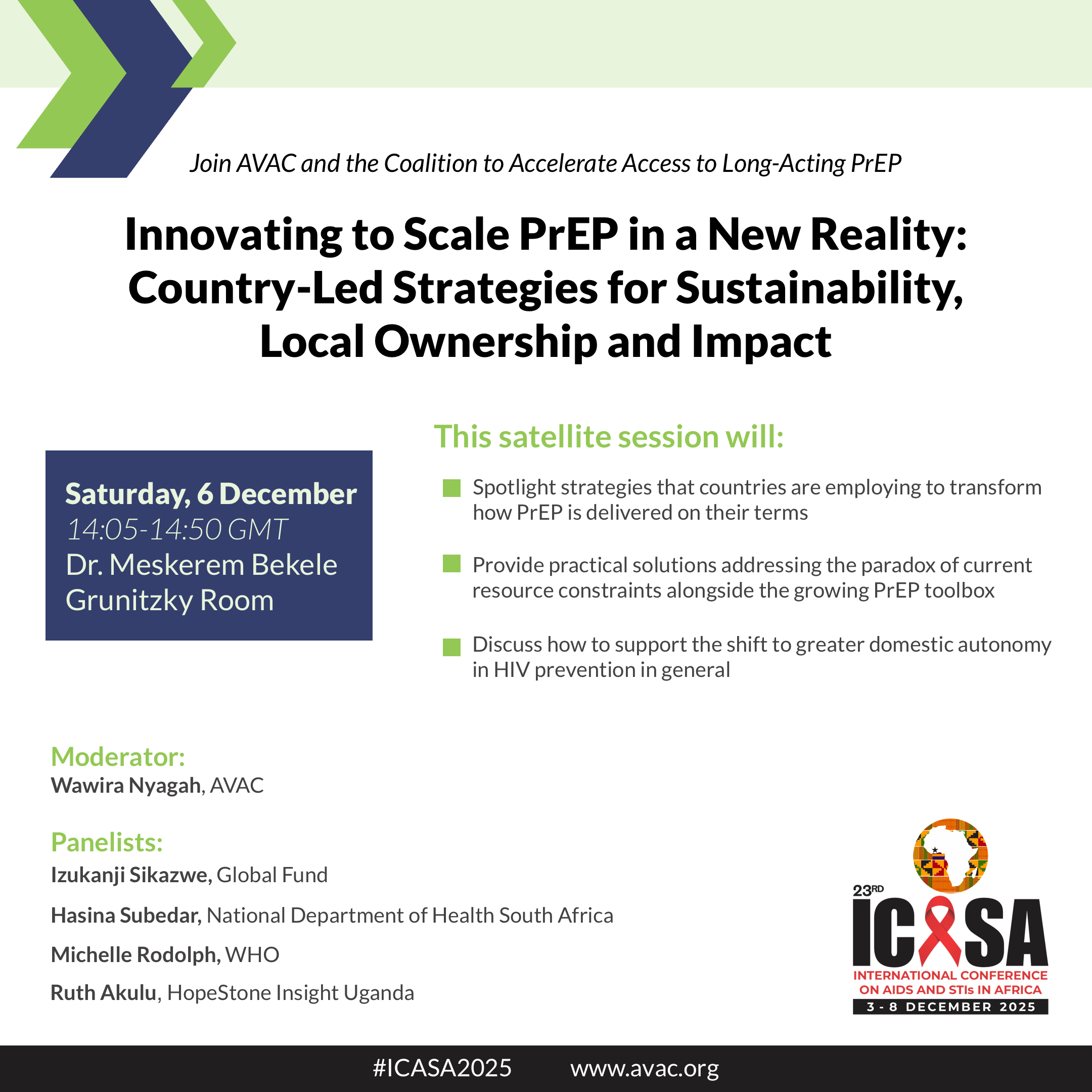 - Innovating to Scale PrEP in a New Reality: Country-Led Strategies for Sustainability, Local Ownership, and Impact, hosted by AVAC and the Coalition to Accelerate Access to Long-Acting PrEP; download flyer, 14:05-14:50