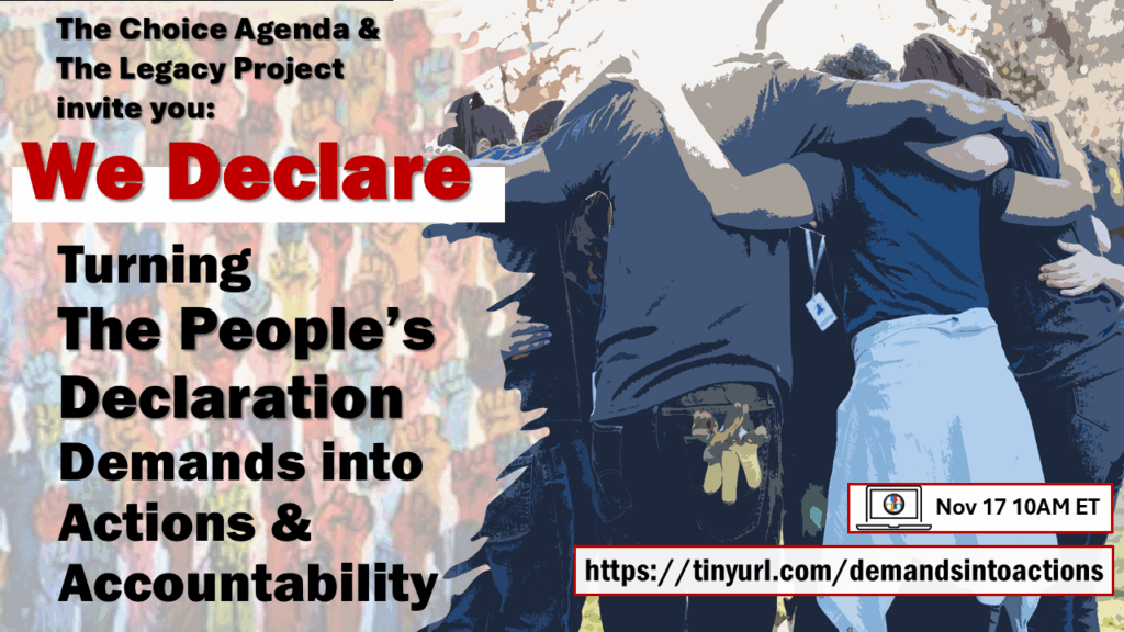 The People’s Declaration—currently with over 500 signatories, charts out a number of community priorities and demands—as noted below. Please join The Choice Agenda, The Legacy Project, and a fabulous global panel to discuss moving those demands into actions and accountability.