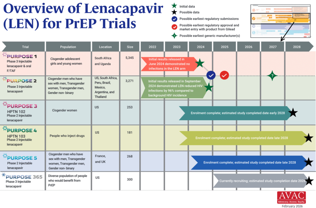 The PURPOSE trials evaluate the safety and efficacy of injectable lenacapavir (LEN), an investigational antiretroviral (ARV) drug being studied as a potential PrEP product. This graphic shows the latest status of all five trials including the groundbreaking results of PURPOSE 1 and PURPOSE 2.