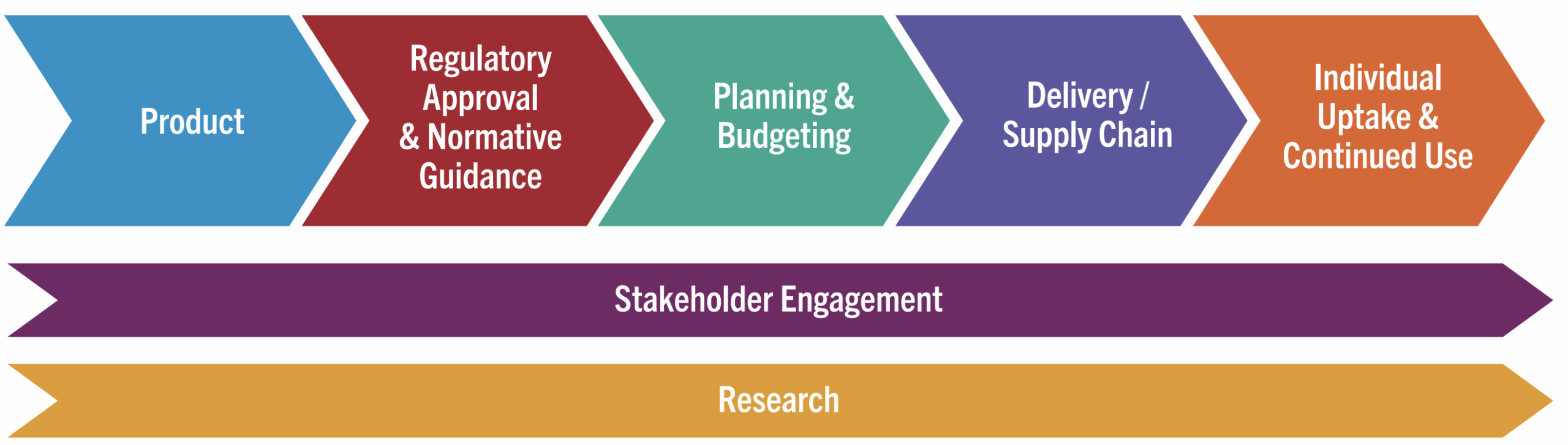 BioPIC developed the Adaptable Product Introduction Framework for all stakeholders involved in product introduction, from clinical research to rollout in low- and middle-income countries. The framework prioritizes activities that must begin in parallel to phase III clinical trials. Stakeholders with a role in early phase product development may also benefit from these considerations with better coordination around anticipated needs.