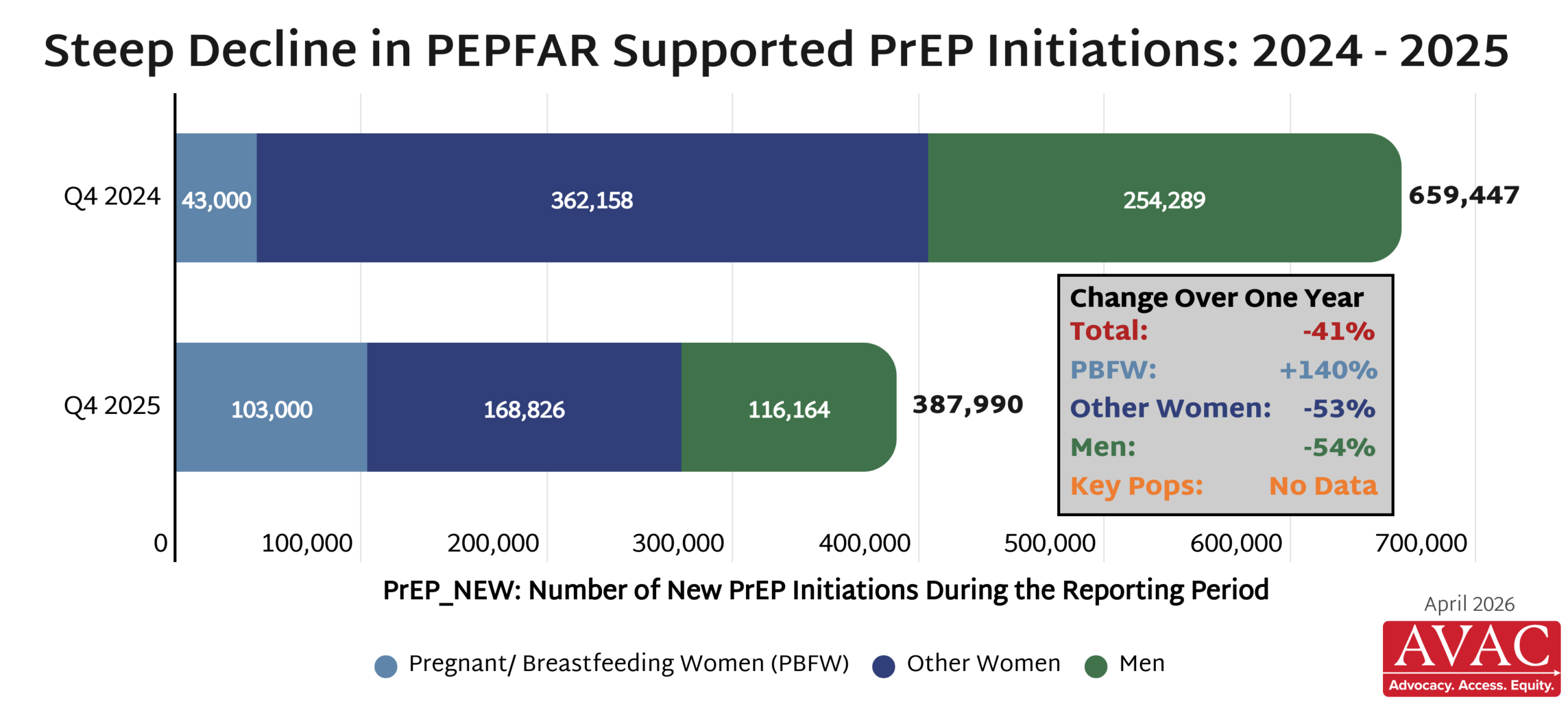 Official characterizations of the HIV response as “doing very good” warrant a closer look at the data. AVAC’s analysis of PEPFAR prevention figures shows PrEP initiations declined 41% in one year, with women and men each seeing drops exceeding 50%. Data on key populations remains unavailable.