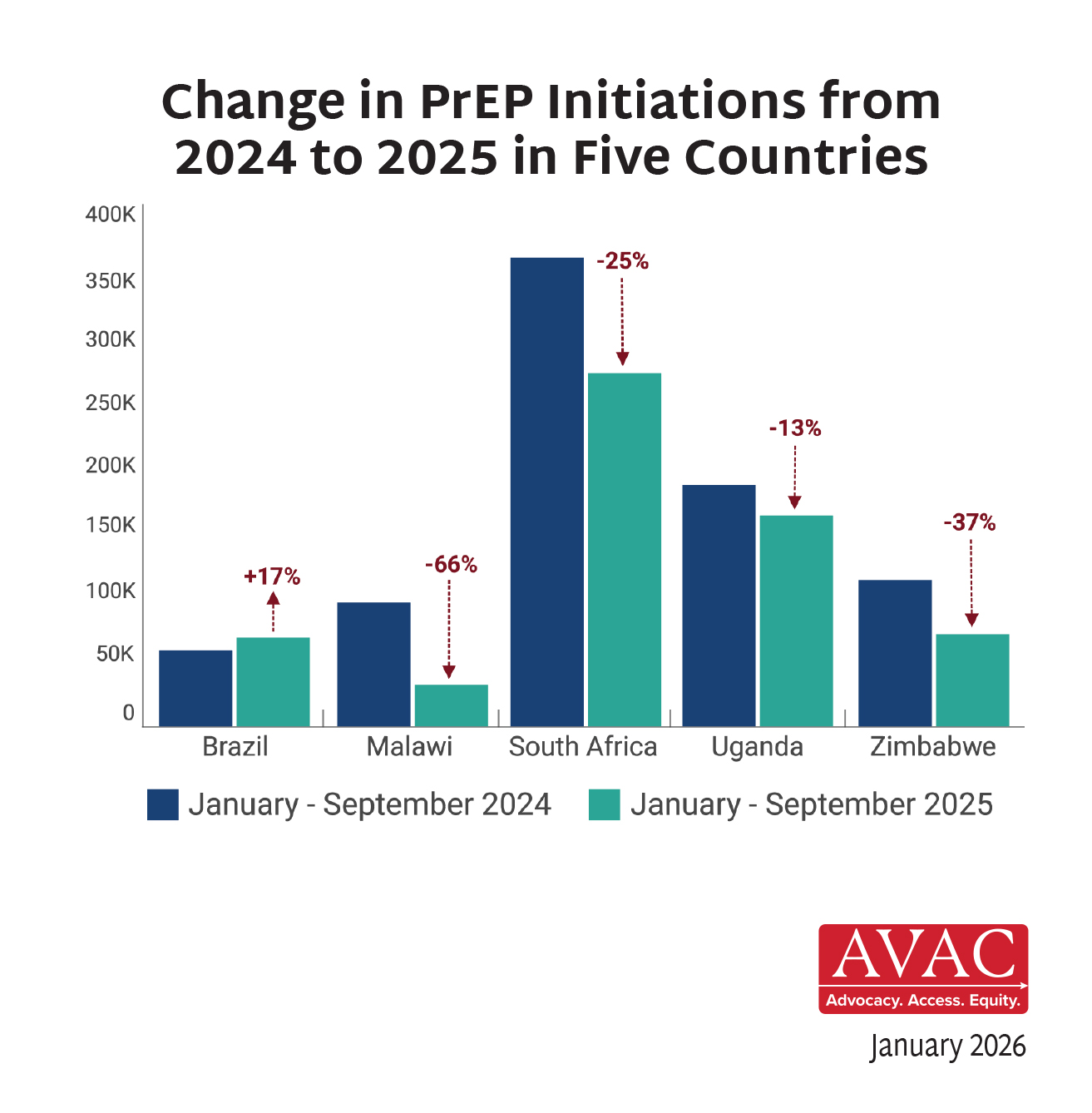 Between the period January-September 2024 to January-September 2025, PrEP initiations fell between 13% and 66% in selected high-volume PrEP countries where ministries of health (MoH) were able to provide data. Among the five countries depicted, four saw significant decline in PrEP uptake. All four relied on PEPFAR PrEP programs and were disrupted by stop work orders (SWO).