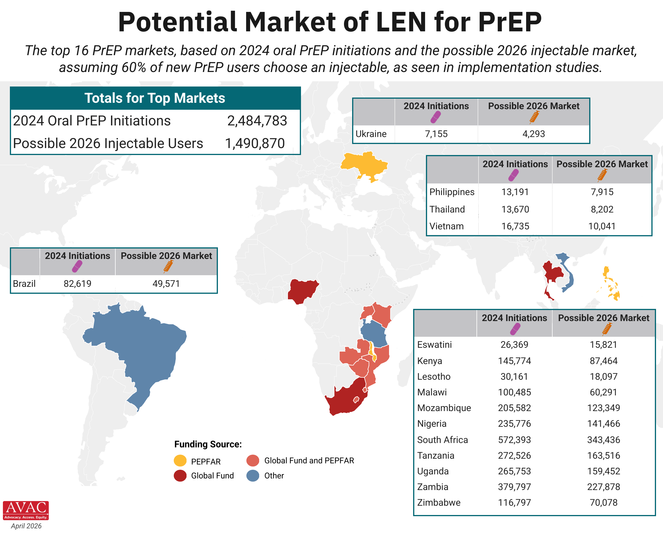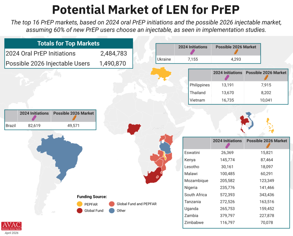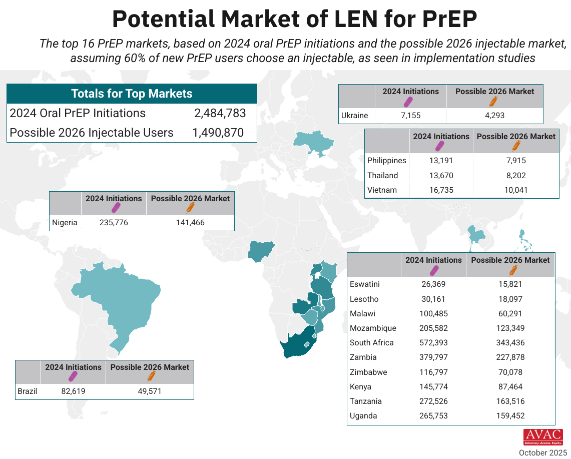 The top 16 PrEP markets, based on 2024 oral PrEP initiations and the possible 2026 injectable market, assuming 60% of new PrEP users choose an injectable, as seen in implementation studies.