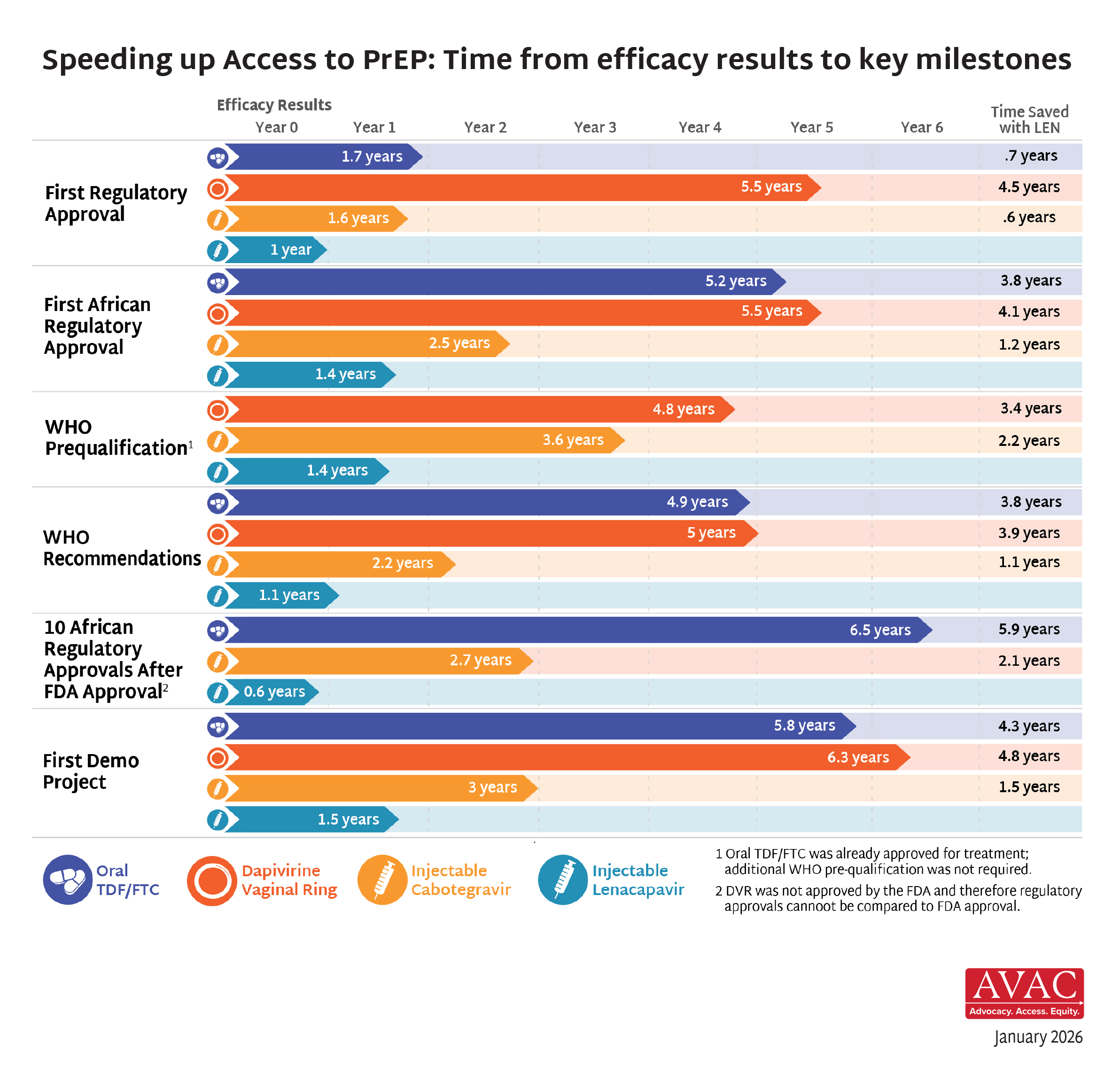 The timeline for hitting key milestones in product introduction is moving faster for injectable LEN than for any previous PrEP products, starting from the announcement of efficacy results in Phase III trials. LEN’s accelerated timeline compared to oral PrEP, DVR, and CAB reflects a field-wide effort to learn lessons from previous PrEP rollout and not repeat the mistakes of the past.