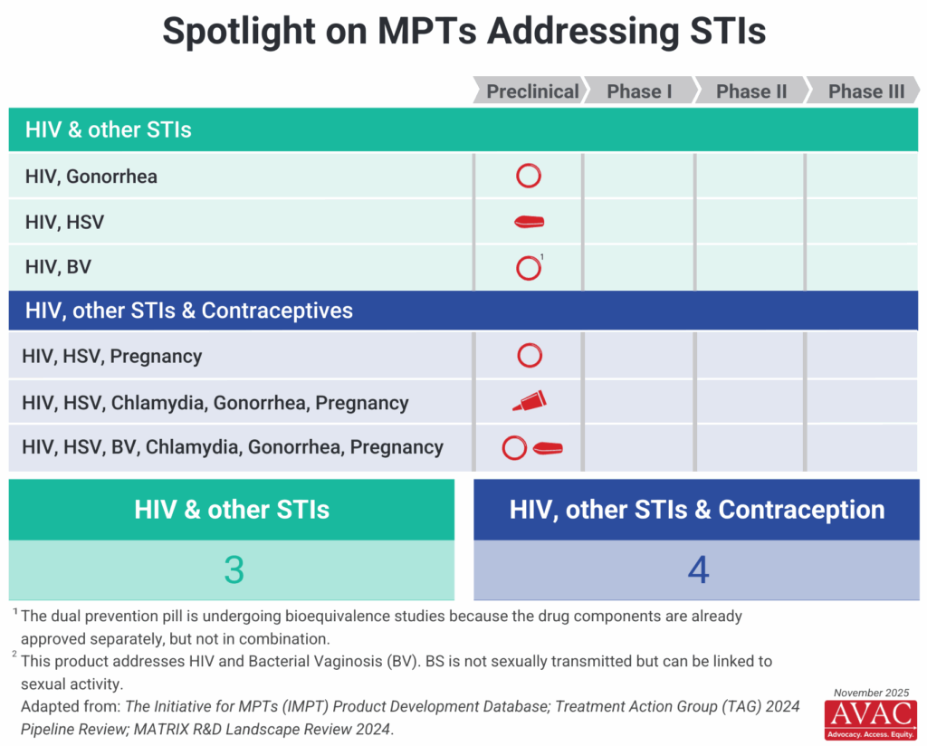 This graphic outlines the development journey of multipurpose technologies (MPTs) that guard against STIs, including HIV, while also preventing pregnancy. It tracks the advancement of various potential products through different trial stages, emphasizing their combined protective roles.