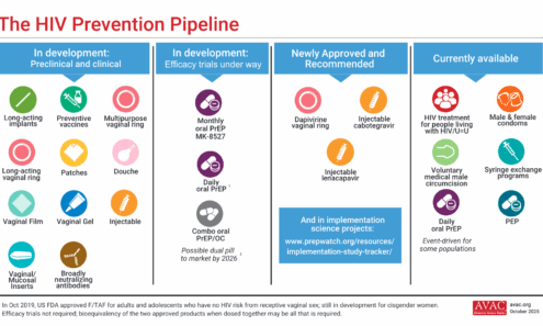 This graphic shows currently available options for HIV prevention, newly approved and recommended treatment, and those in development.