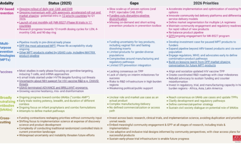 From the People’s Research Agenda, this graphic tracks the pipeline of potential new HIV prevention options across broadly neutralizing antibodies, preventive vaccines, pre-exposure prophylaxis, and multipurpose technologies.