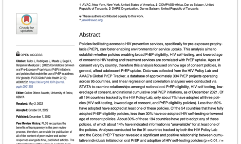 This article from PLoS Global Public Health presents the results of an analysis examining whether policies enabling broad PrEP eligibility, HIV self-testing, and lowered age of consent to HIV testing and treatment services are correlated with PrEP uptake.