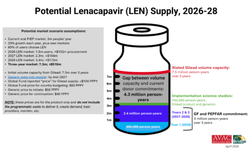 Lenacapavir has the potential to reach millions — and the momentum is building. Using the current oral PrEP market as a baseline, this graphic estimates what demand for LEN could look like through 2028 and shows how current donor commitments stack up against that opportunity.