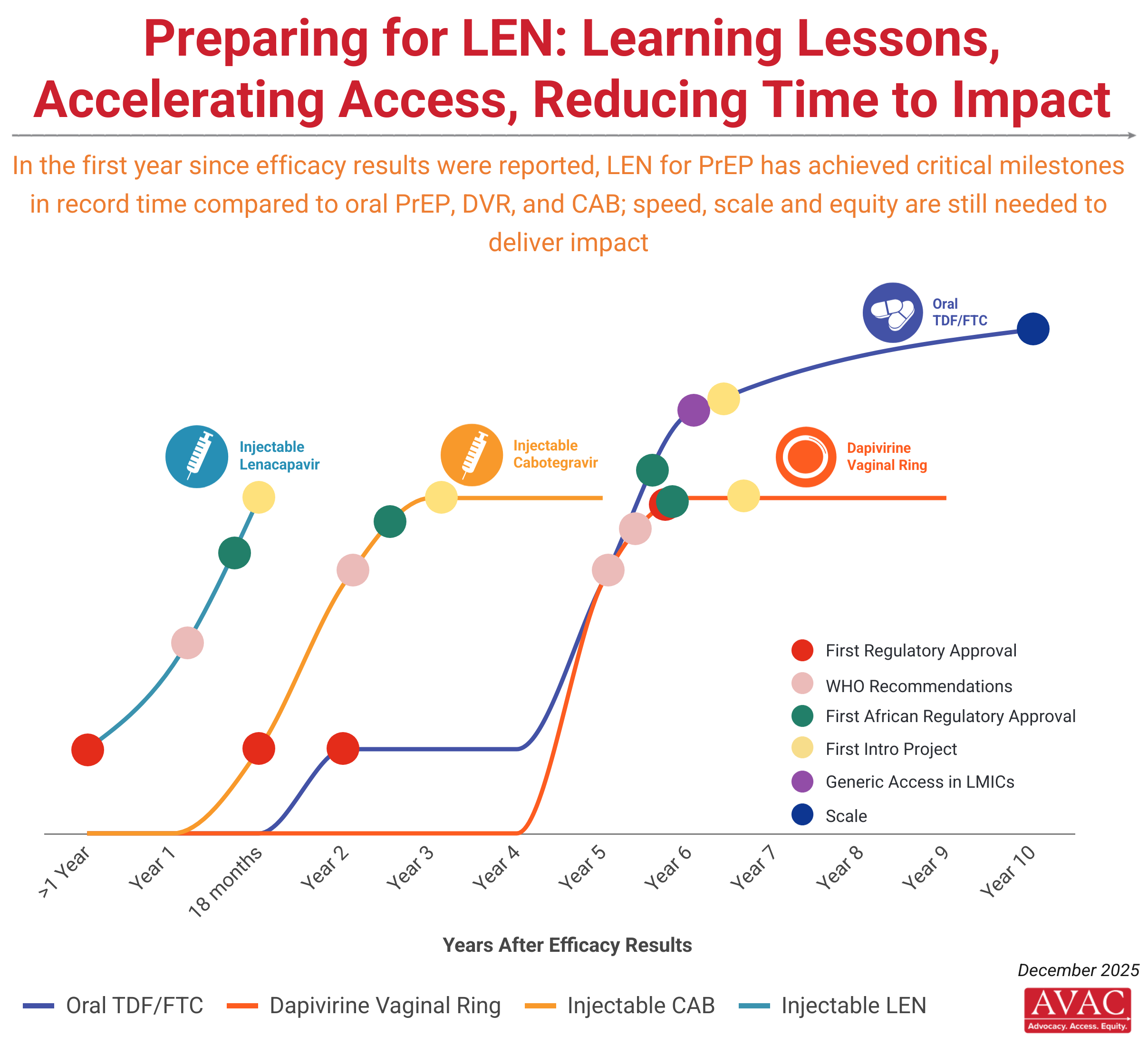 In the first year since efficacy results were reported, LEN for PrEP has achieved critical milestones in record time compared to oral PrEP, the dapivirine vaginal ring, and injectable cabotegravir. Speed, scale, and equity are still needed to deliver impact.