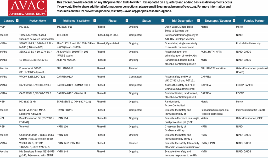 This tracker provides details on key HIV prevention trials to watch. It is updated on a quarterly and ad-hoc basis as developments occur. If you would like to share additional information or corrections, please email Breanne at [email protected].