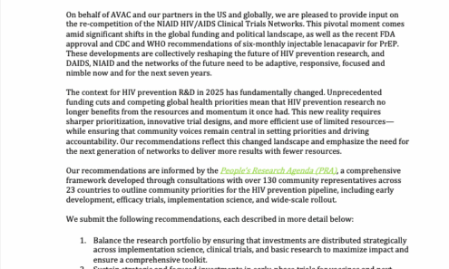 AVAC’s formal input submitted on the re-competition of the NIAID HIV/AIDS Clinical Trials Networks. The recommendations were informed by the People’s Research Agenda (PRA), a comprehensive framework developed through consultations with over 130 community representatives across 23 countries.
